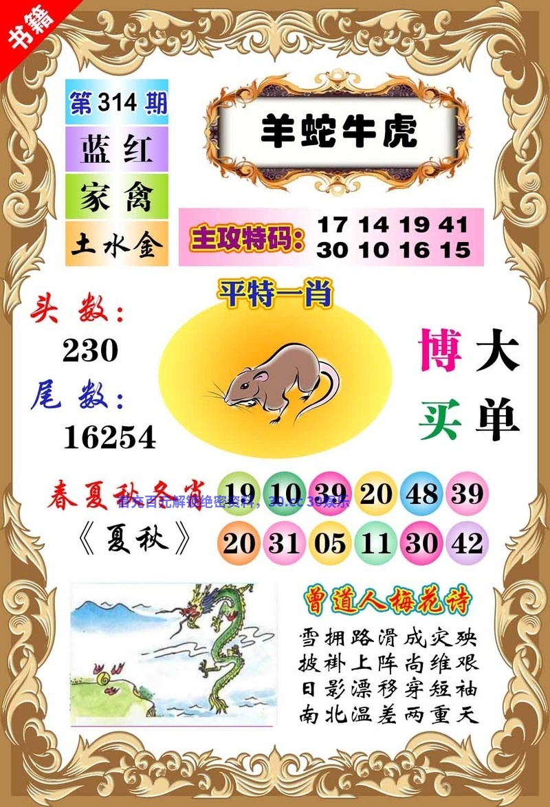 318期曾道人梅花诗:三四相接二五知,一路高歌在三门,水中花开出燕容,峰回路转出旺波 解释:三四相接二五知,一路高歌在三门,水中花开出燕容,峰回路转出旺波解马虎肖 综合解肖:马虎羊牛鼠兔龙猴狗 主特12码:12.36.04.16.11.35.05.17.06.18.03.27 | ||||||||||||||||||||||||||||||